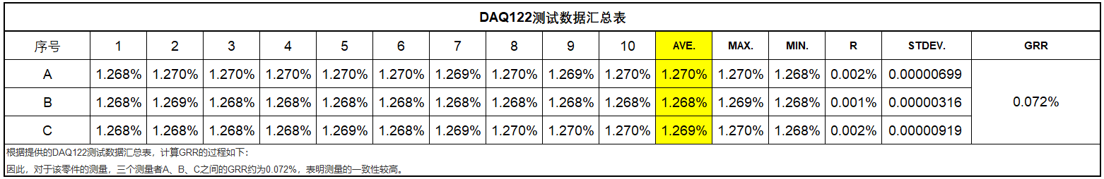 Таңдалған деректерді жинау картасының талаптарға сәйкес келетініне көз жеткізу үшін ME командасы оны сынады. Талдау көрсеткендей, таңдалған деректерді жинақтау картасы тамаша тұрақтылыққа ие, GRR үш A, B және C өлшегіштері арасында шамамен 0,072% құрайды.