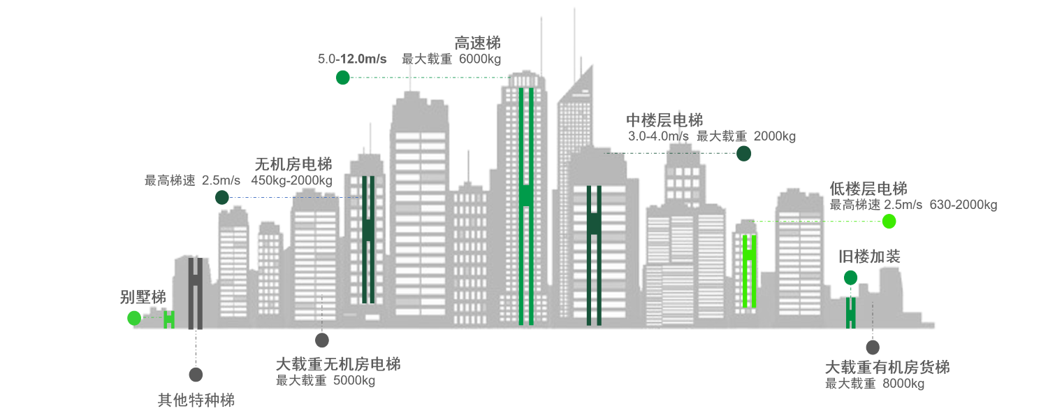 Біз ең көп жүк көтергіштігі 6000 кг (2:1 қатынасы) және максималды жылдамдығы 12 м/с (1:1 қатынасы) бар қолдану сценарийлеріне сәйкес келетін тартқыш машиналар мен сәйкес негізгі құрылғылардың кең ауқымын ұсынамыз. Тұтынушылар лифт параметрлеріне негізделген қолайлы үлгілерді тікелей таңдай алады, бұл дизайн циклін айтарлықтай қысқартады.